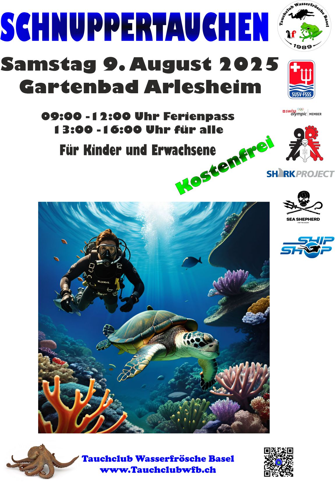 Die Fotos vom Schnuppertauchen können, ab dem 10.08.2025 bis zum 24.08.2025 im Passwortgeschützten Bereich Fotos Schnuppertauchen 2025 angesehen oder auch heruntergeladen werden. Die Logondaten für den Fotobereich erhalten Sie am Samstag im Schwimmbad Arlesheim. Nach dem 24.08.2025 werden alle Daten aus dem Verzeichnis gelöscht es existiert kein Backup